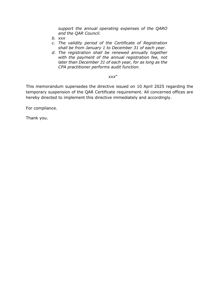 MEMORANDUM: Resumption of the Quality Assurance Review Certificate as a requirement for accreditation of individual CPAs, firms/partnership engaged in the practice of public accountancy.